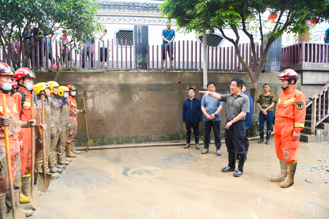 Huang Zeyuan, director of the Provincial Emergency Management Department, rushed to Bikou Town, Wenxian County to guide the flood relief and mass resettlement work, and expressed condolences to the officers and men who were draining and dredging. Team leader Wu Zhenkun and political commissar Cai Jianbo respectively went deep into the disaster area in Longnan to guide the flood fighting and disaster relief work, visited and consoled the frontline commanders and soldiers at each emergency relief operation point, inspected the food and accommodation guarantee of the commanders and soldiers on the spot, and asked the commanders and soldiers in detail about the dredging, danger removal and rotation, encouraging the commanders and soldiers to work hard, carry forward the fine style of not being afraid of hardship and dare to fight hard, and vowed to win the flood fighting and rescue task in an all-round way.
