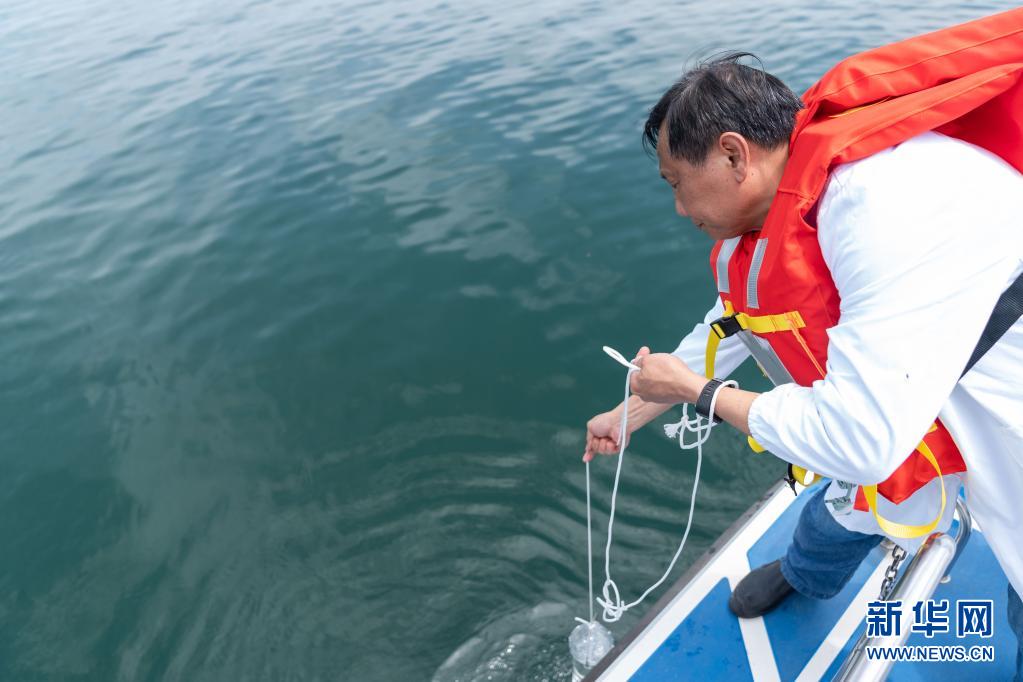 On May 20th, Tang Yuanchang, executive deputy director of the Technical Committee of Midline Water Company, showed how to collect water samples at the dam front monitoring section of Danjiangkou Reservoir in danjiangkou city, Hubei Province. Xinhua News Agency reporter Cai Yang photo