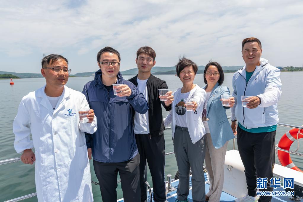 On May 20th, in the monitoring section in front of Danjiangkou Reservoir in danjiangkou city, Hubei Province, the water quality monitoring personnel and media reporters in the reservoir area of the Middle Route of South-to-North Water Transfer Project showed the collected water samples. Xinhua News Agency reporter Cai Yang photo